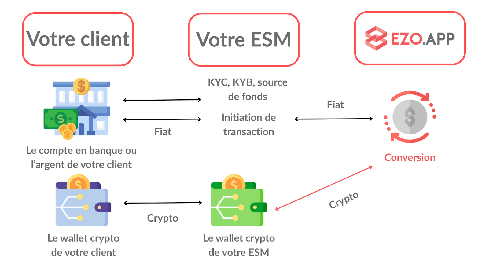 Le processus fonctionne généralement ainsi : votre esm collecte les fonds fiduciaires auprès de votre client, que vous envoyez en CAD ou USD à EZO. EZO exécute l’achat ou la vente crypto via son OTC desk. Les actifs numériques sont livrés directement à votre wallet ou dans le cas d’une vente, les fonds fiduciaires sont renvoyés à votre compte bancaire.